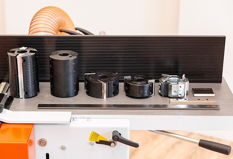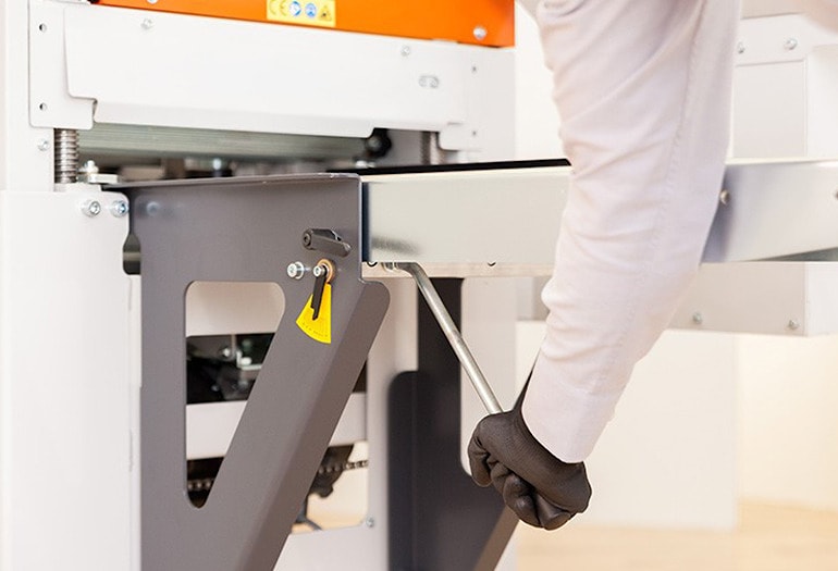 Установка высоты строгания Высота строгания легко регулируется с помощью рукоятки, которая поворачивает 4 стержня с резьбой для перемещения: • верхней части строгально-калевочного станка, изменяющей положение верхней горизонтальной фрезы на MP360 и MP365. Обе модели имеют улучшенные резьбовые стержни по сравнению с моделями MP260. • чугунный стол с нижним горизонтальным ножом и боковыми ножами на MP260ECO и MP260.   На станках MP260ECO и MP260 нижняя горизонтальная фреза прикреплена к чугунному столу. Глубина резания нижней фрезы устанавливается путем добавления или удаления регулировочных стальных пластин, расположенных на чугунном строгальном столе перед нижней фрезой (макс. глубина строгания 4 мм).   Металлические пластины разной толщины поставляются с каждым строгально-фрезерным станком и легко меняются. На MP360 и MP365 нижний горизонтальный нож можно регулировать, не выключая машины, с помощью рычага, который устанавливает высоту подающего стола (макс. глубина строгания 8 мм).   Обе горизонтальные ножевые головки могут быть оснащены строгальными и / или фрезерными ножами. На всех строгально-фрезерных станках серии Wood-Mizer используются регулировочные кольца и втулки для установки высоты боковых фрез.   Сверхпрочная конструкция Строгальные станки Wood-Mizer изготавливаются из комбинации стали и чугуна. Чугунные детали обеспечивают высокое демпфирование вибрации, долговечность, антипригарные свойства и устойчивость к деформации. Мы обрабатываем чугунный блок до желаемых размеров с помощью фрезерного станка с ЧПУ, чтобы получить идеально ровную поверхность. Чугун используется для строгальных и формовочных столов (внутри строгального станка между фрезами).   Доступна дополнительная смазка чугунных поверхностей, которая защищает их от коррозии и снижает трение материала. Стальные части строгально-калевочных станков устойчивы к коррозии и обладают высокой прочностью. Сталь имеет очень высокое соотношение прочности и веса. • MP260ECO и MP260 могут быть дополнительно оснащены 4 колесиками для перемещения этих машин внутри пространства цеха, что делает их портативными.   • Конструкция MP360 и MP365 предусматривает возможность поднимать и перемещать эти станки с помощью вилочного погрузчика.   Режущие головки Обе боковые фрезы • В MP260ECO и MP260 имеют диаметр 90 мм и высоту до 100 мм.   • В MP360 и MP365 имеют диаметр 90 мм и высоту до 120 мм. • Пятый универсальный шпиндель в MP365 имеет диаметр 90 мм и высоту до 100 мм, на шпиндель могут быть установлены другие режущие инструменты.   Режущие головки можно вынуть, ослабив одну стопорную гайку наверху стандартного 30-миллиметрового шпинделя. Многие из наших клиентов предпочитают покупать дополнительные боковые режущие головки, чтобы переход с одного профиля на другой занимал меньше времени. Опционально доступны боковые ножи различной высоты и конфигурации (с 2, 3 или 4 пазами (слотами) для ножей, 40 мм, 90 мм или 120 мм).   • На боковые режущие головки можно установить ножи длиной на 10 мм больше, чем сам шпиндель. - Ножи 50 мм на режущей головке 40 мм - Ножи 100 мм на режущей головке 90 мм - Ножи 130 мм на режущей головке 120 мм Каждая боковая режущая головка приводится в действие отдельным двигателем мощностью 3 кВт. • Под заказ на MP360 и MP365 может быть установлен двигатель для боковых ножей мощностью 4 кВт. Левая боковая фреза подвижная, ее положение 
